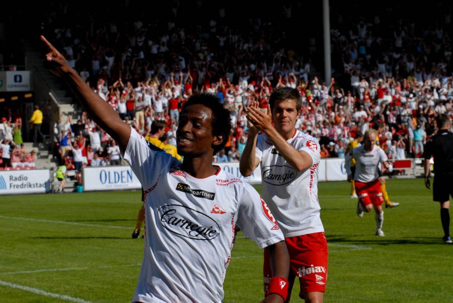 Amin Askar ble matchvinner hjemme mot Start i 2009 og fikk fortjent applaus av Joachim Thomassen. Foto: Rolf. B. Gundersen/fredrikstadfk.no.