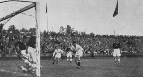 Ullevaal 18. juni 1936. De norske spilerne i mørke trøyer er fra