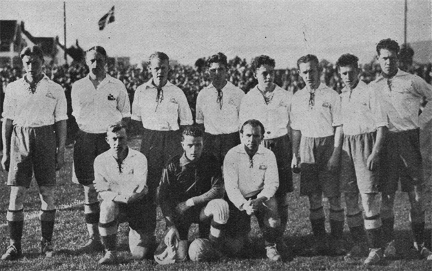 Norges landslag som tapte 0-2 for Tyskland på Ullevaal 23. september 1928. Fra venstre: Erling Lunde, Andreas Johansen (Fredrikstad), Jacob Berner, Gunnar Christensen, Karl Pedersen (Fredrikstad), Sten Moe (Fredrikstad), Børresen, Oskar Thorstensen, Robert Danielsen, Sverre Berg-Johannesen, Ingar Pedersen. Dette var Moe, Pedersen og Børresens landslagsdebut.
