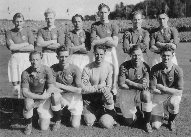 Landslaget som slo Danmark 2-0 på Ullevaal 16. september 1951. Bak fra venstre: Gunnar Thoresen, Per Bredesen, Odd Wang Sørensen, Thorbjørn Svenssen, Ragnar Hvidsten, Gunnar Dahlen. Foran: Thorleif Olsen, Erik Holmberg (Fredrikstad), Tom Blohm, Harry Boye Karlsen og banens gigant; Bjørn Spydevold.
