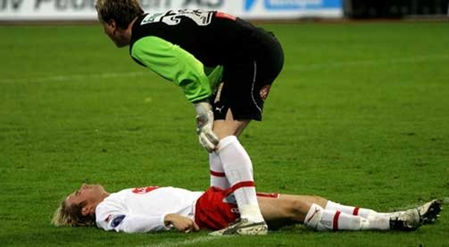 Etter fem minutter fikk hjemmelaget corner fra høyre. FFK lå med alle mann i egen 16-meter for å forsvare seg. Ballen ble slått inn i FFKs felt der Øyvind Hoås steg til værs for å heade ballen ut. Rett bak ham sto en Startspiller og Dagfinn Enerly. Hoås fikk en rotasjon i luften og landet med hele kroppen på nakken til Enerly som umiddlebart smalt i bakken.