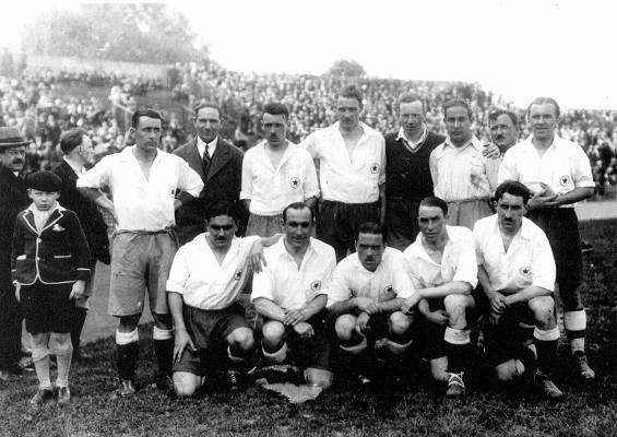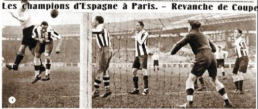 Egil Brenna Lund (helt til venstre i stripete drakt) i kamp for Red Star Paris mot de spanske cupmestrene Real Unión Club de Irún i 1927. Foto: allezredstar.com