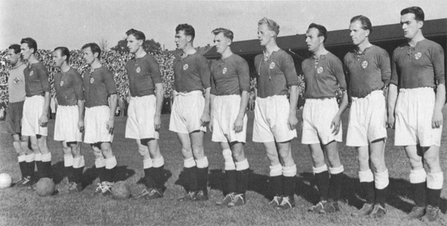 Landslaget som ble nordiske mestere etter å ha slått Sverige 4-3 i Göteborg 30. september 1951. Fra venstre: Tom Blohm, Holmberg, Harry Boye Karlsen, Egil Lærum, Thorbjørn Svenssen, Bjørn Spydevold (Fredrikstad), Gunnar Thoresen, Per Bredesen, Odd Wang Sørensen, Ragnar Hvidsten, Gunnar Dahlen.