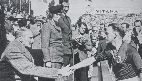 FFKs kaptein Gunnar Andreassen hilser på Lyn-kaptein Øyvind Holmsen før den første NM-finalen i 1945.