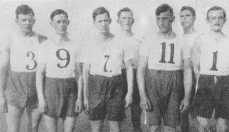 Medlemmer av Fredrikstad Idrettsforening under et stevne i Oslo i 1916. Gustav Edén står som nr. 3 fra venstre.