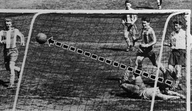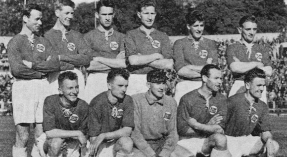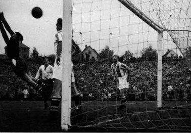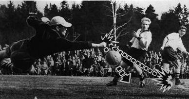 Fra finalen mot Sarpsborg i 1948. Henry Johannessen sender ballen