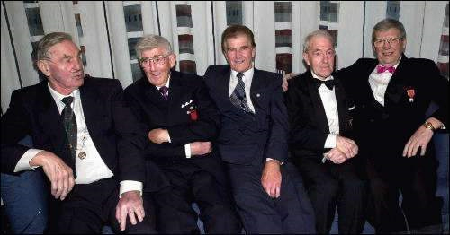 Fem FFK-veteraner samlet til klubbens 100-årsjubileum i april 2003. Fra venstre: Odd Aas, Henry Johannessen, Odd Karlsen, Odd Andersen og Per Spydevold. Foto: Trond Thorvaldsen