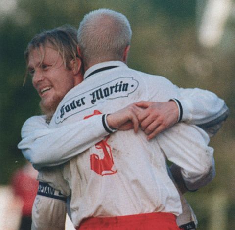 i løpet av 1998-sesongen. Her gir han Joacim Jonsson en klem.