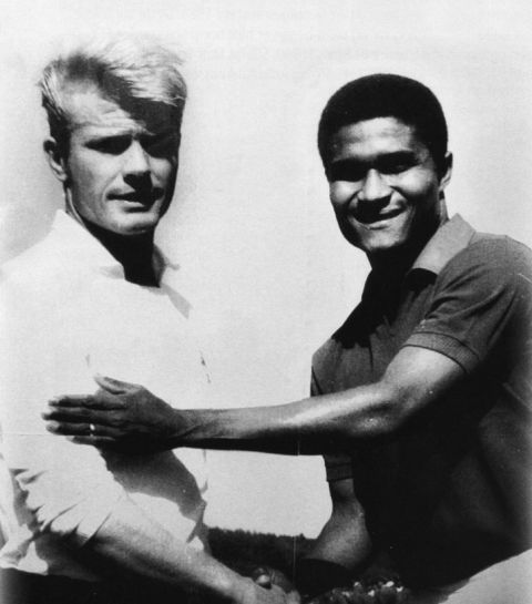 Roar Johansen hilser på Portugals stjernespiller Eusebio