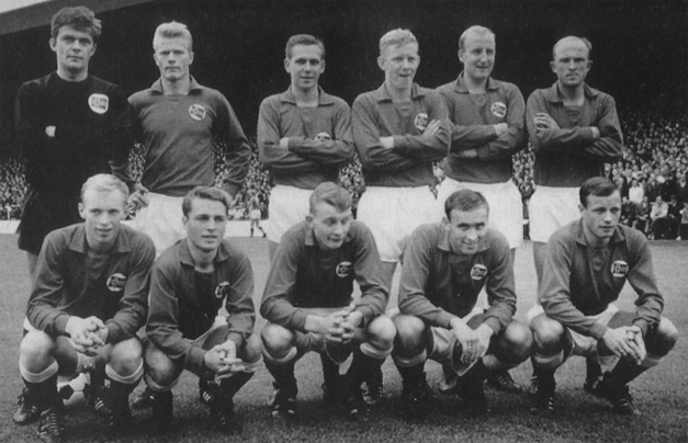 Norges lag som slo Sverige 3-1 på Ullevaal 3. september 1967. Bak fra venstre: Kjell Kaspersen, "Pontus", Tore Børrehaug, Nils Arne Eggen, Finn Thorsen, Trygve Bornø. Foran: Sven Otto Birkeland, Harald Sunde, Odd Iversen, Olav Nilsen, Harald Berg.